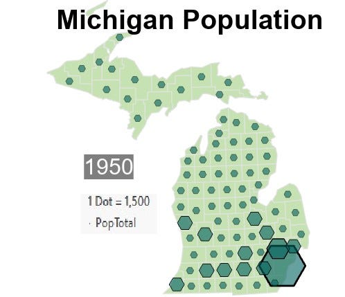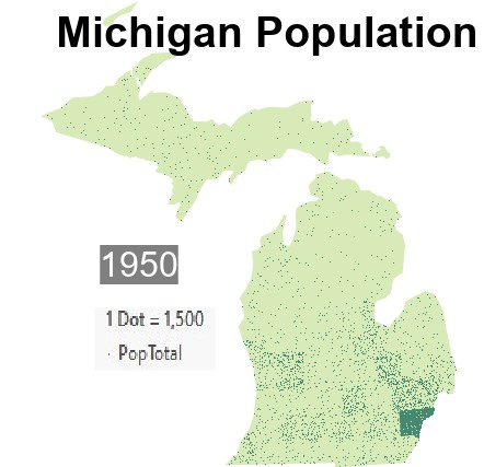 I lowered the population per dot from 1 = 20,000 to 1 = 1500. The size was changed as well so that this change wouldn’t be overwhelming and become a big blur.